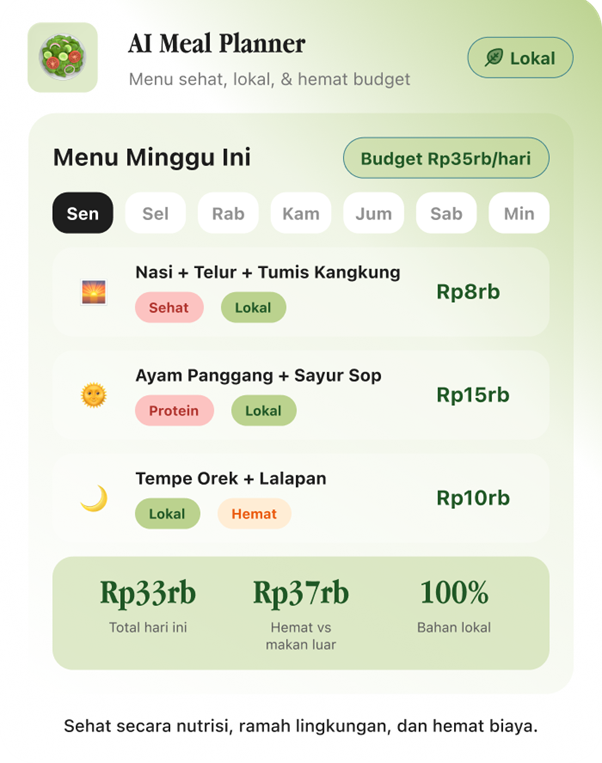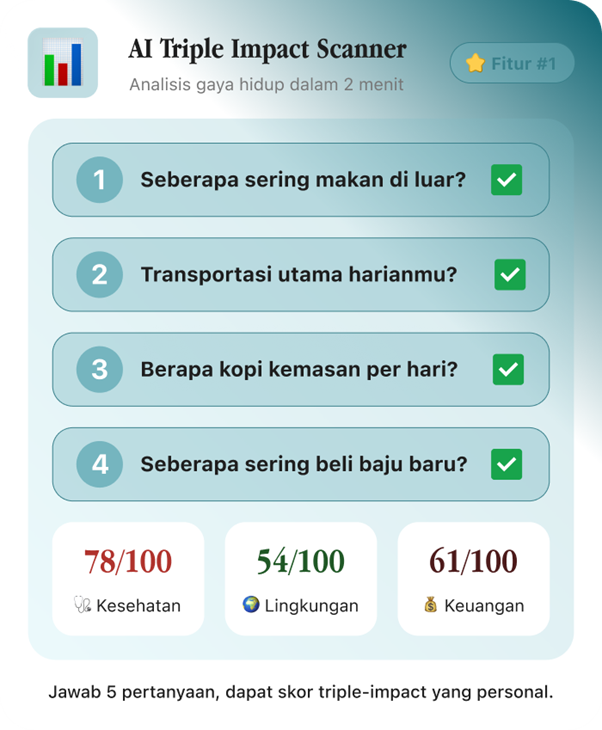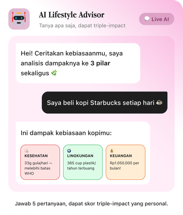 Platform AI yang membantu Anda menyelaraskan gaya hidup agar lebih sehat, ramah lingkungan, dan hemat finansial — secara bersamaan.